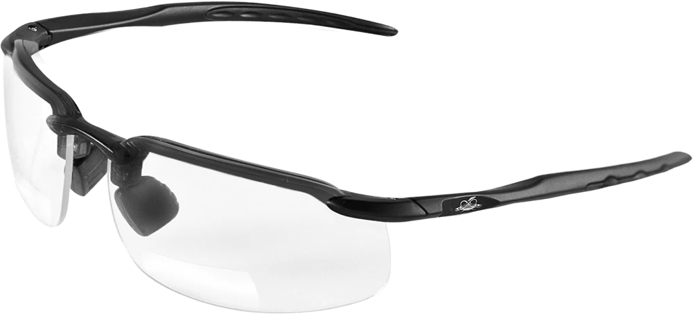 Bifocal reader style lenses feature a magnification diopter positioned at the bottom inside of the lens. This improves workplace safety by eliminating the need to switch between safety and reading glasses. In addition to lens correction, Swordfish® Readers safety glasses also feature an adjustable nose piece for increased comfort.