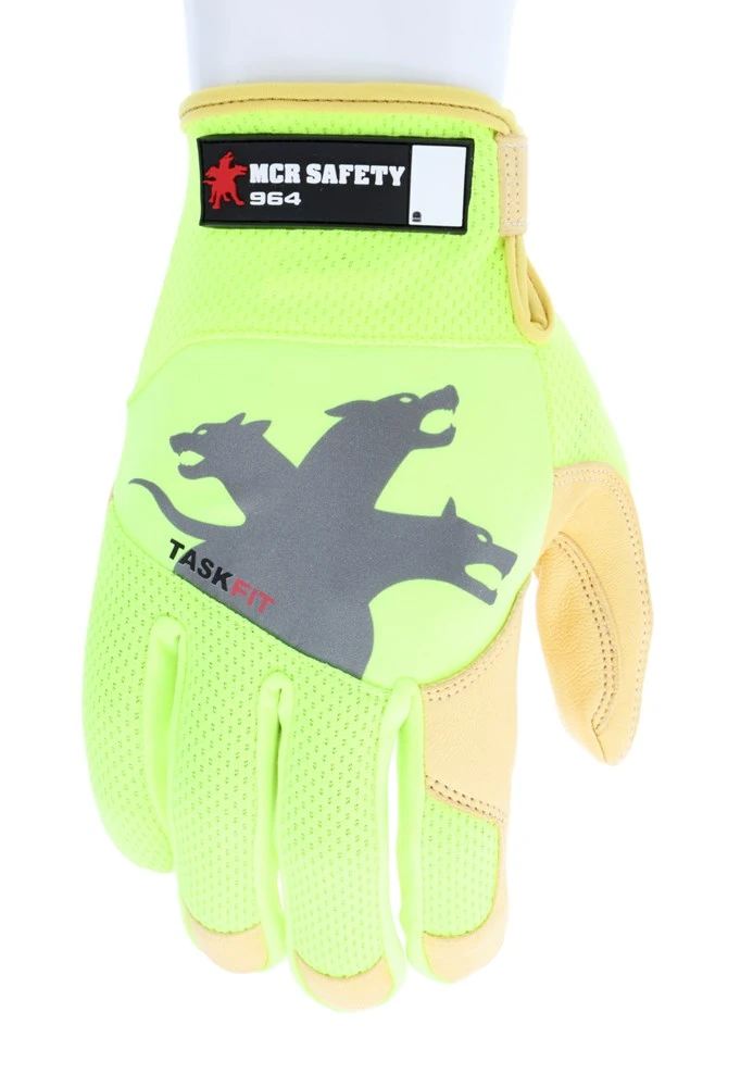 Safety, comfort, and style. These are the attributes industrial workers want in the PPE they wear. The MCR Safety 964 honey gold/lime “TaskFit™” designed hook and loop cuff mechanics gloves fit the need. The 964 features a high visibility lime super stretch knuckle region for greater flexibility, super soft top grain honey gold goatskin leather palm, and reflective logo on the back for added safety. The D3O® palm padding aids in reducing impact and vibration. The reinforced index finger and thumb crotch adds durability in the high stress areas.